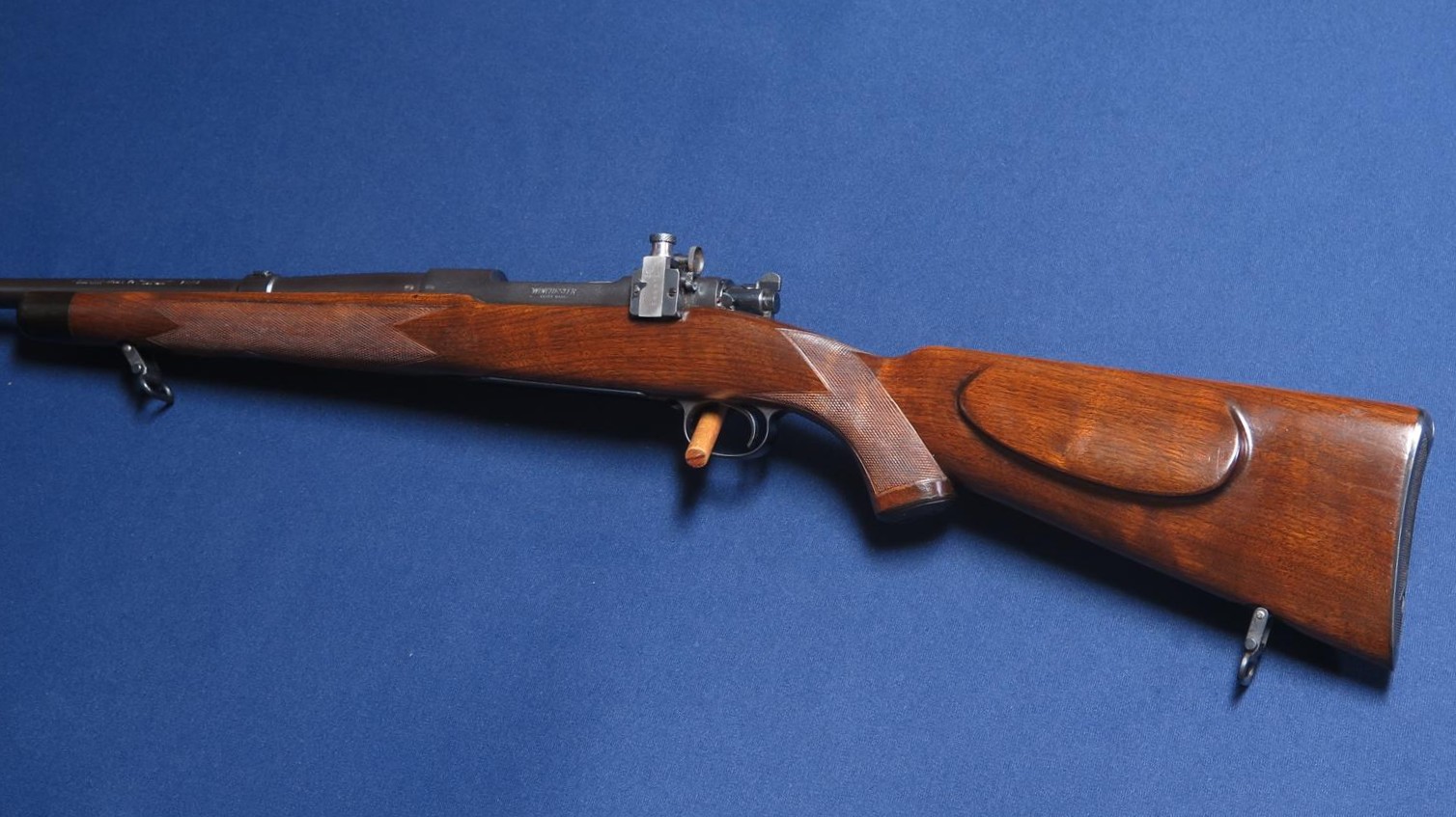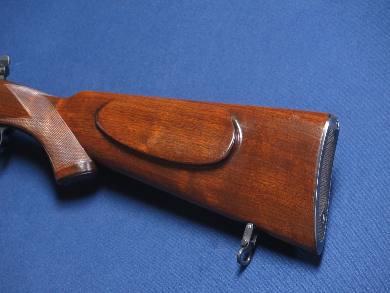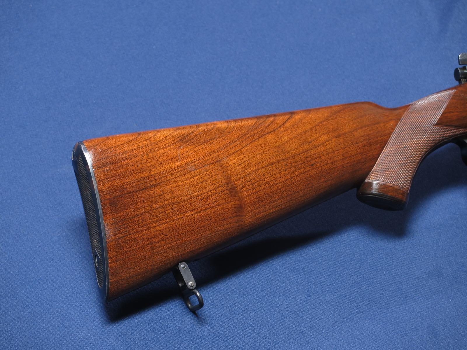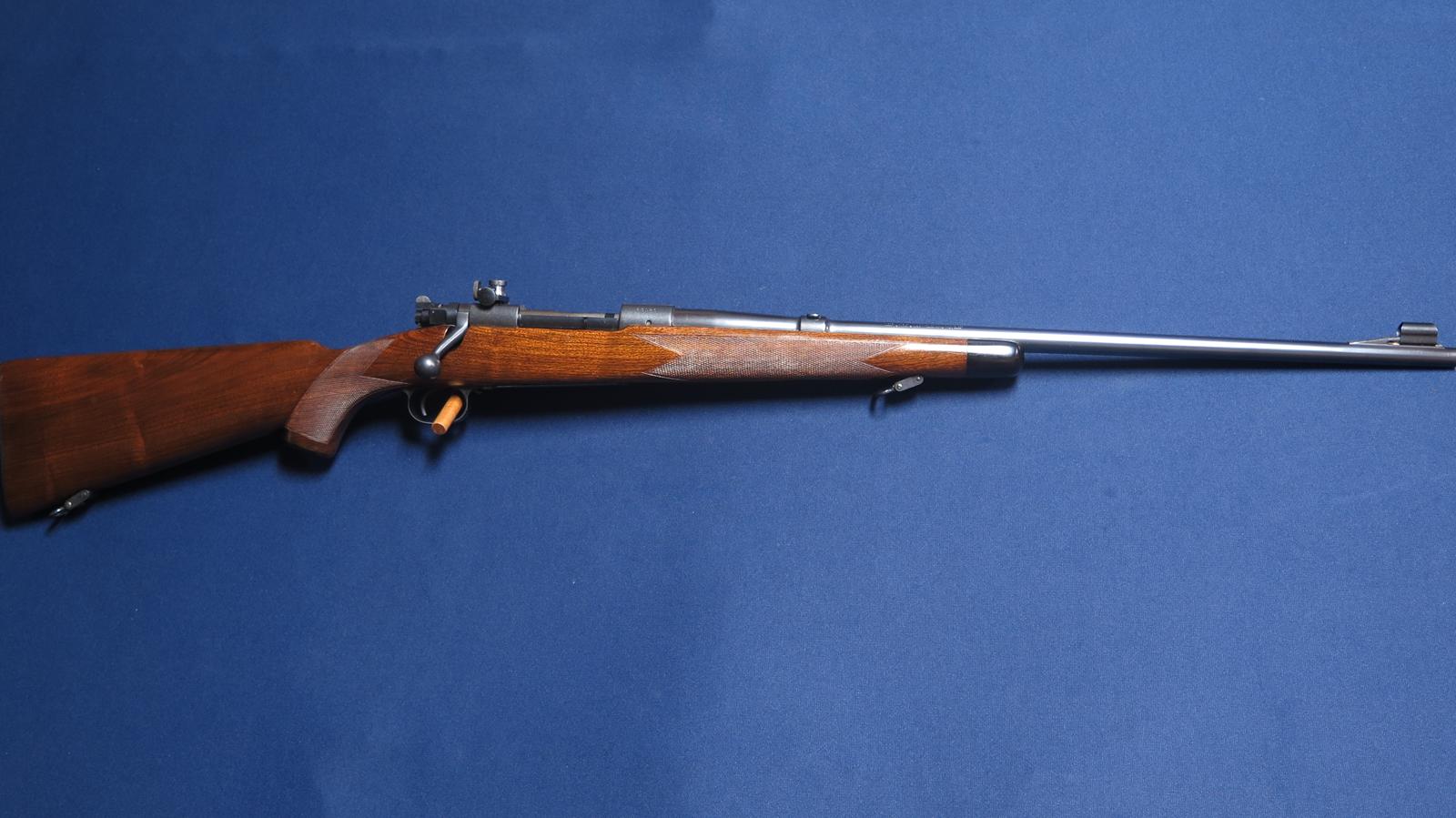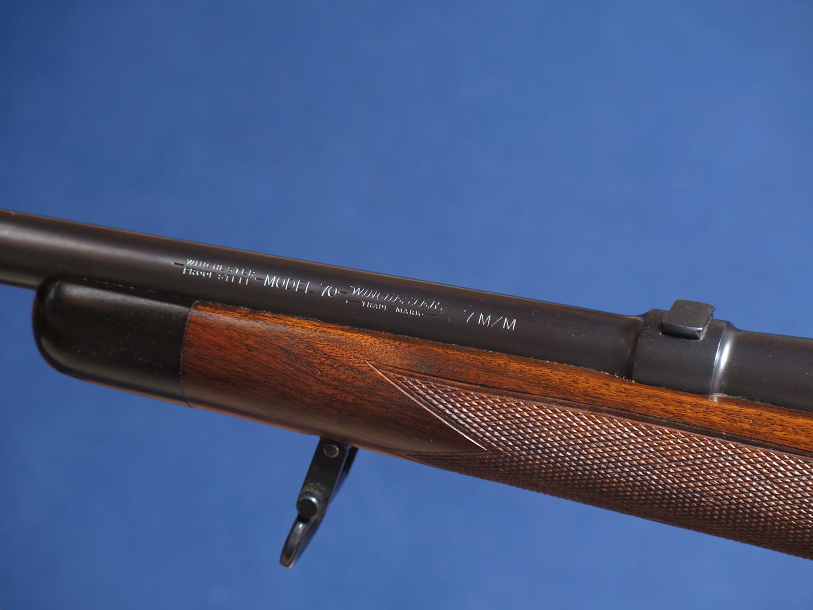 Winchester 70 Super Grade 7mm. 1942 mfg. 24 inch barrel. Clover leaf tang. Correct super grade swivels and Redfield brass front sight. No extra holes. Lyman 48 peep sight. Blank insert in rear sight. Very clean original finish model 70. Correctly stamped 7mm on bottom of barrel. Excellent bore.