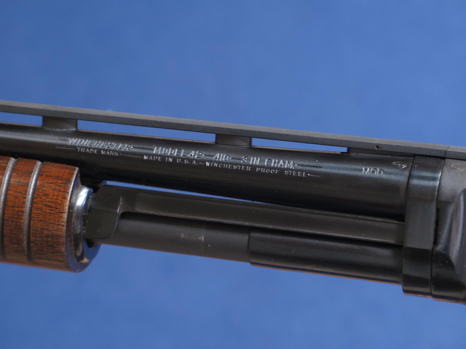 Winchester 42 410. 1955 mfg. 26 inch Simmons vent rib. 3 inch. 14 inch LOP. Wood shows a few handling marks. Excellent bore.