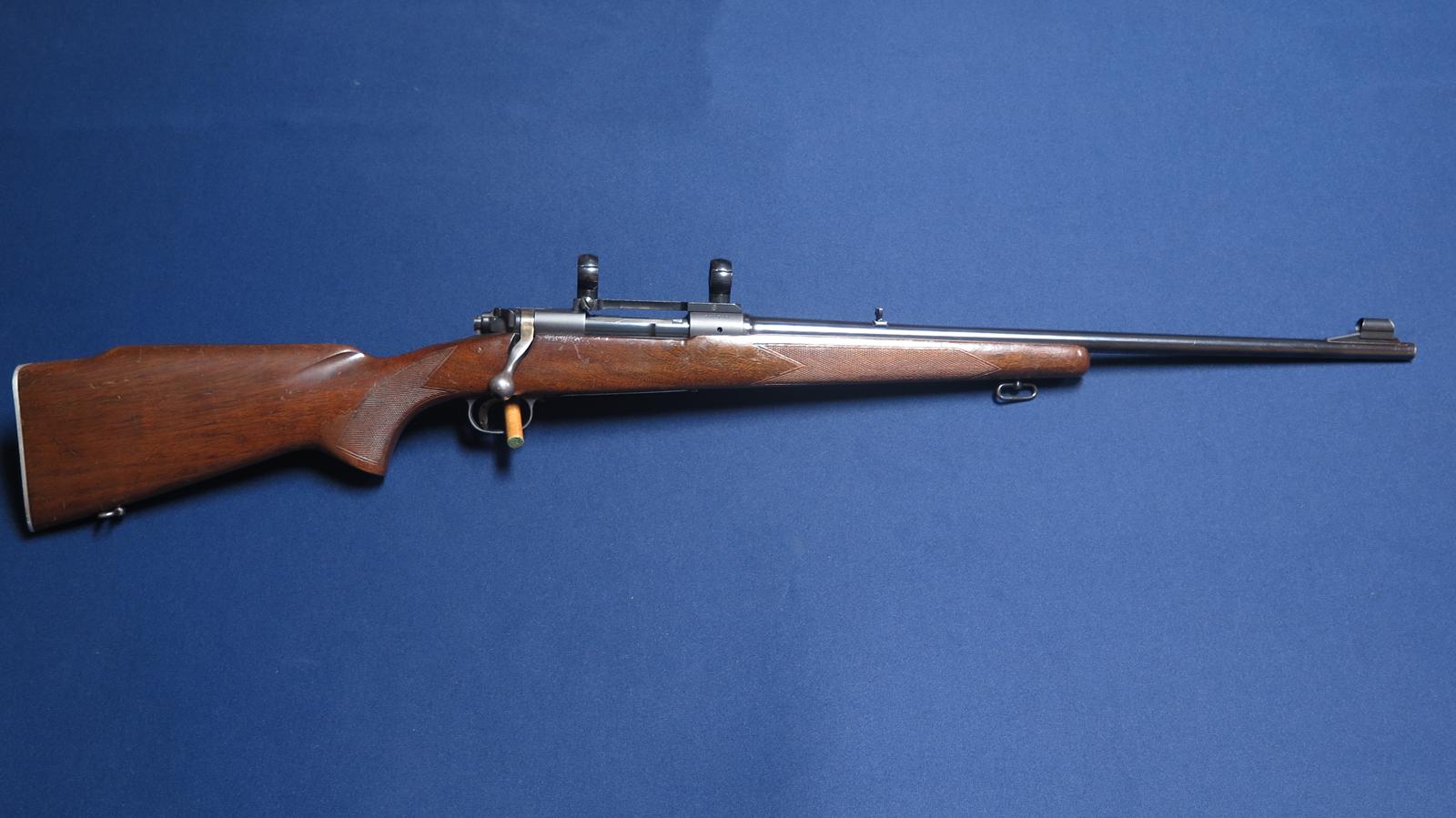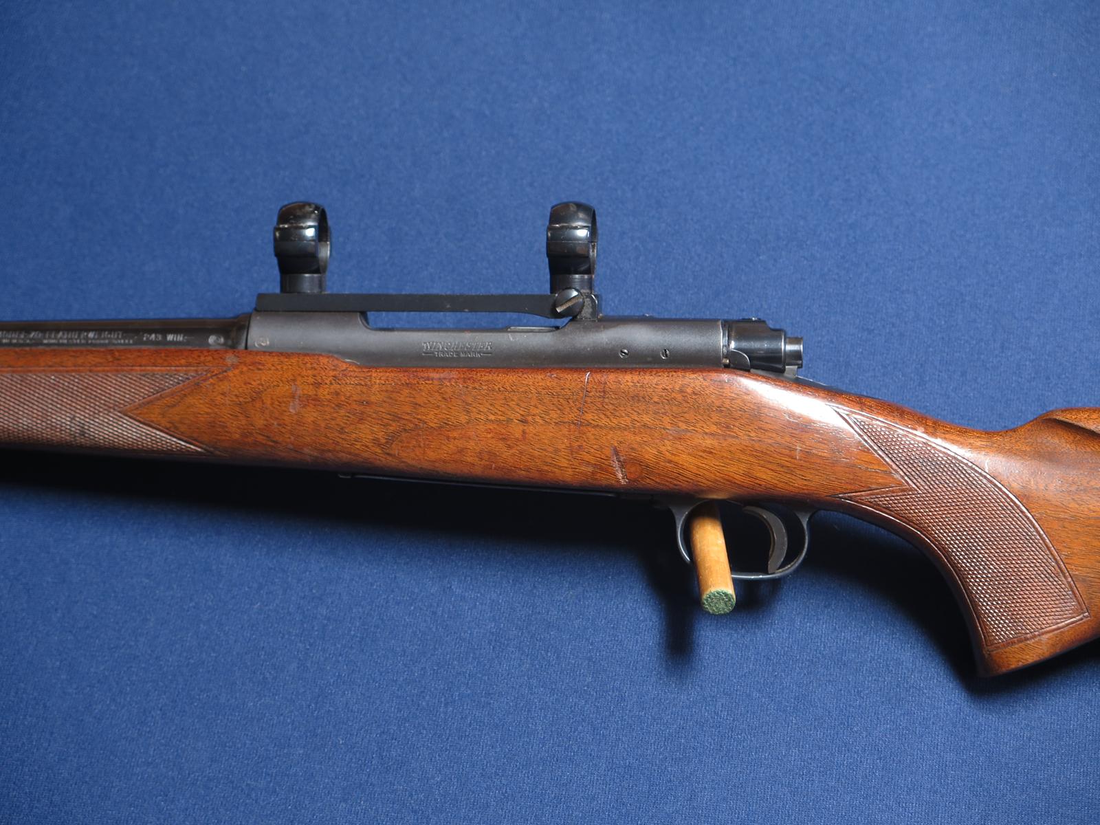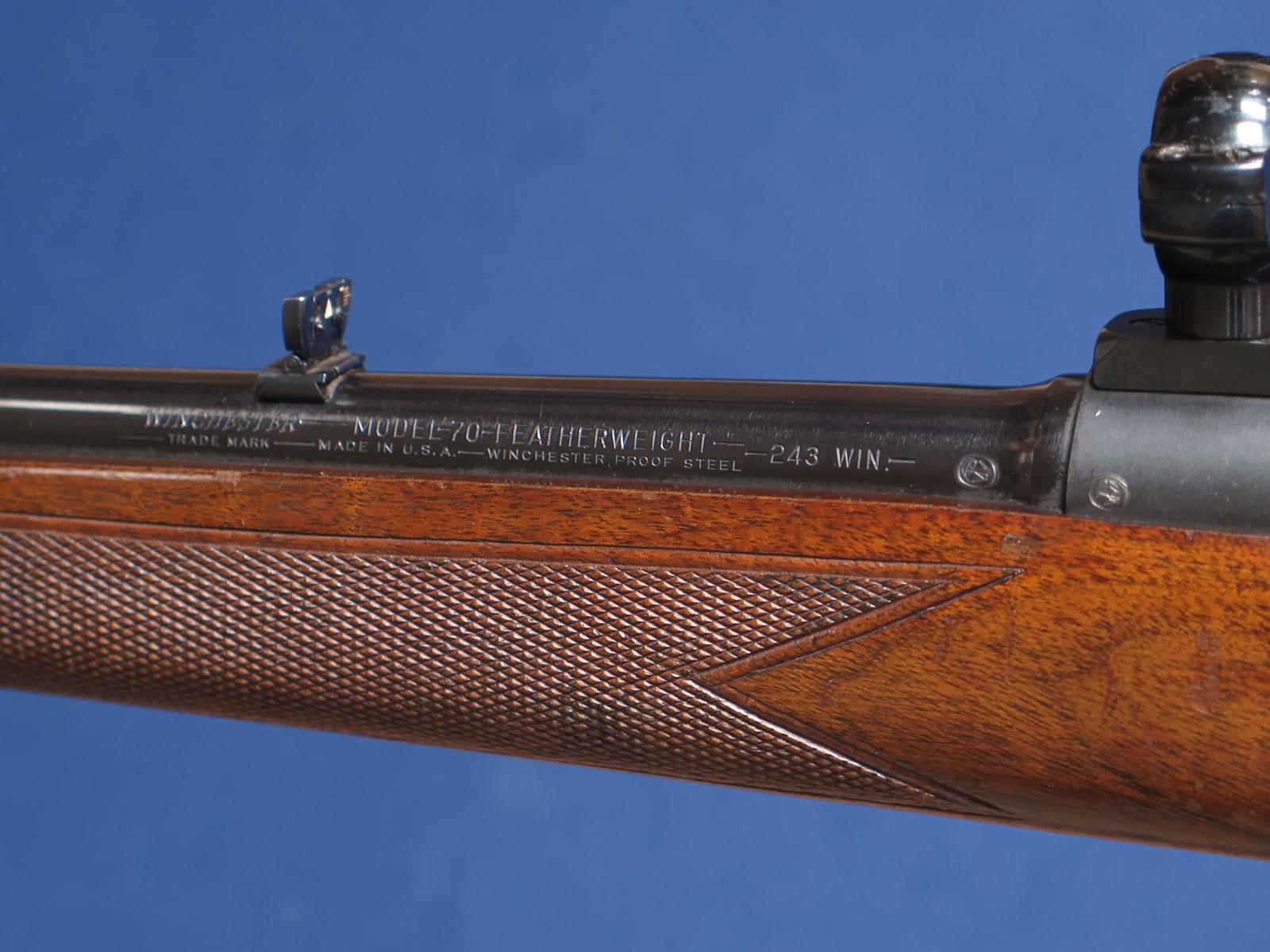 Winchester 70 Featherweight 243. 1956 mfg. 22 inch barrel. Redfield scope base and rings. Original finish. 97% blue. Wood shows handling marks. Excellent bore.