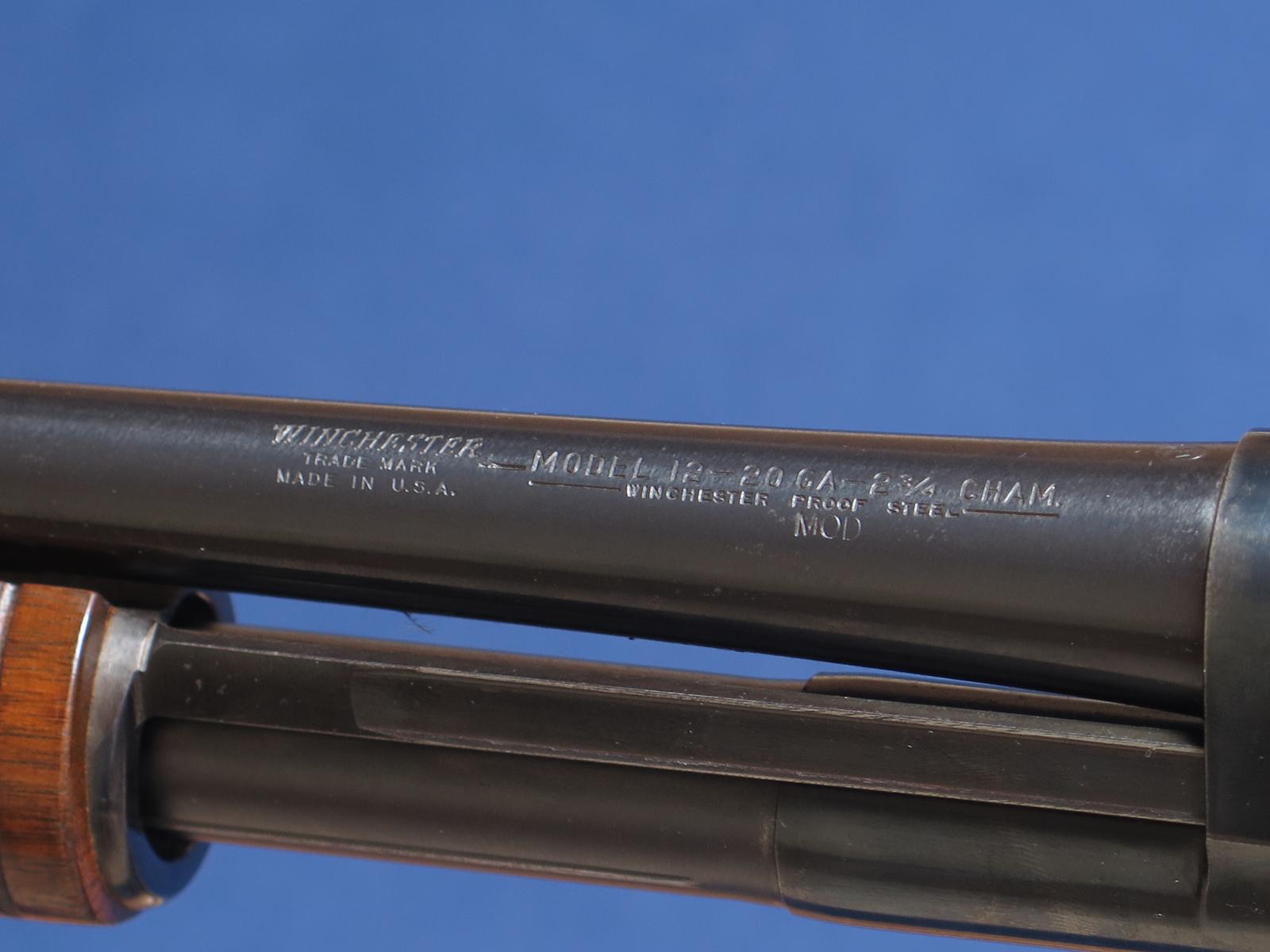 Winchester 12 20ga. 1956 mfg. 28 inch barrel. Mod choke. 14 1/8 LOP. Original finish. Has 2 hairline cracks in toe of stock. Excellent bore.