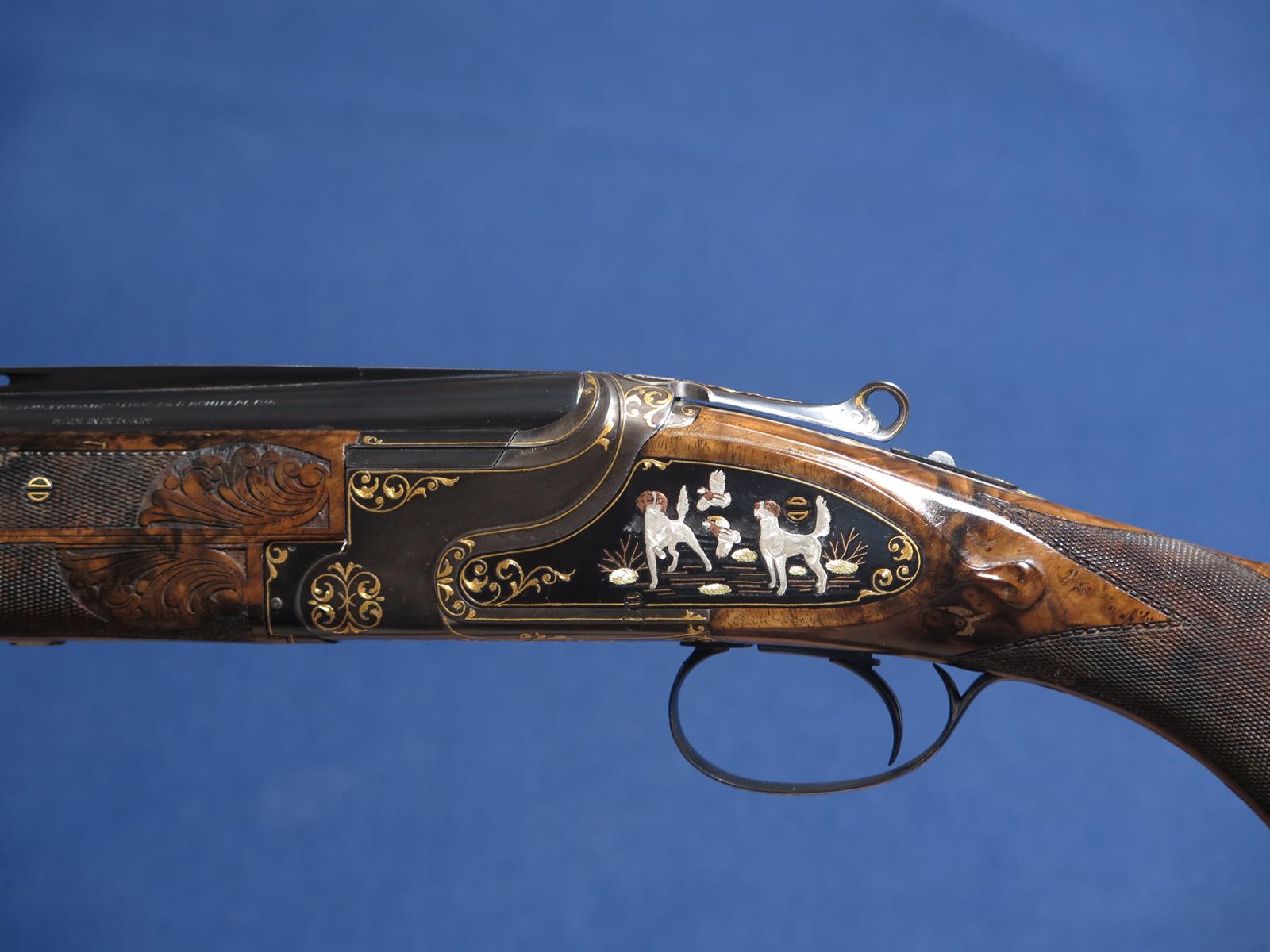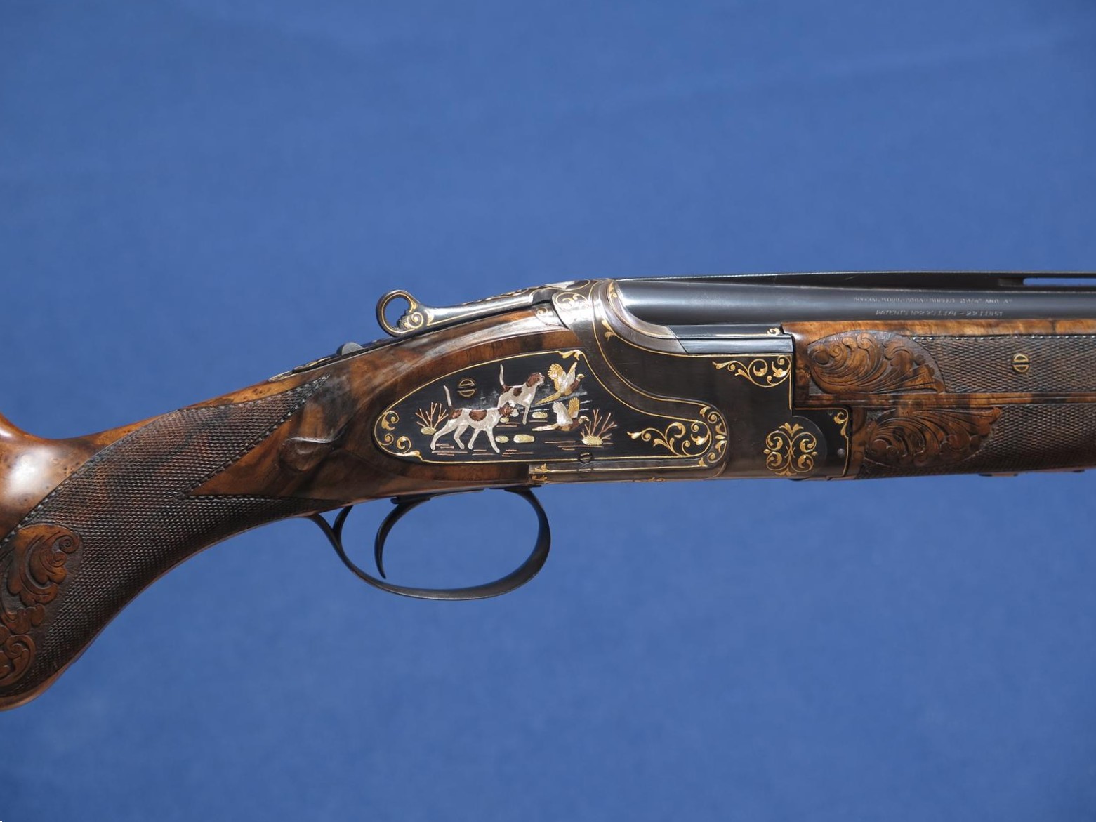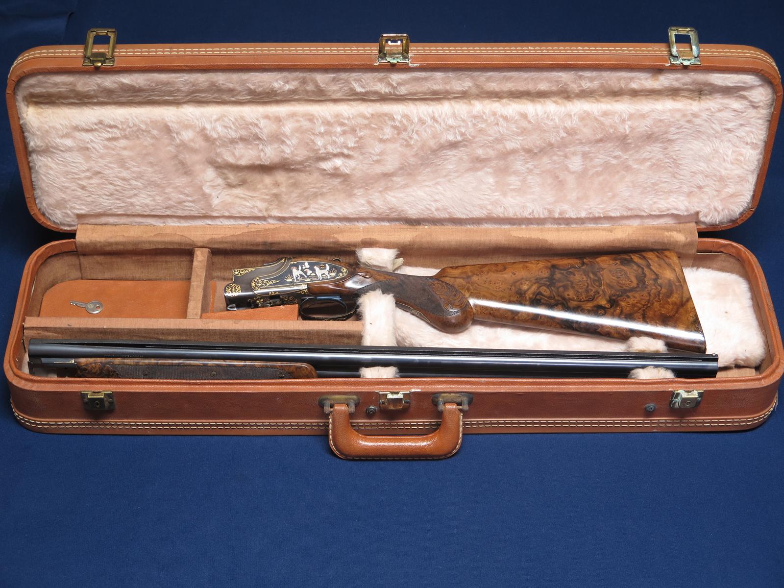 Browning Superposed Exhibition 20ga. Engraved by R. Capece. 1964 mfg. 28 inch barrels. Mod and Full. Beautifully engraved with Dogs and Pheasants on one side and Dogs and Quail on the other. Long tang round knob. 14 5/8 LOP checkered butt. Excellent condition with a few light handling marks by butt plate. In Browning luggage case.