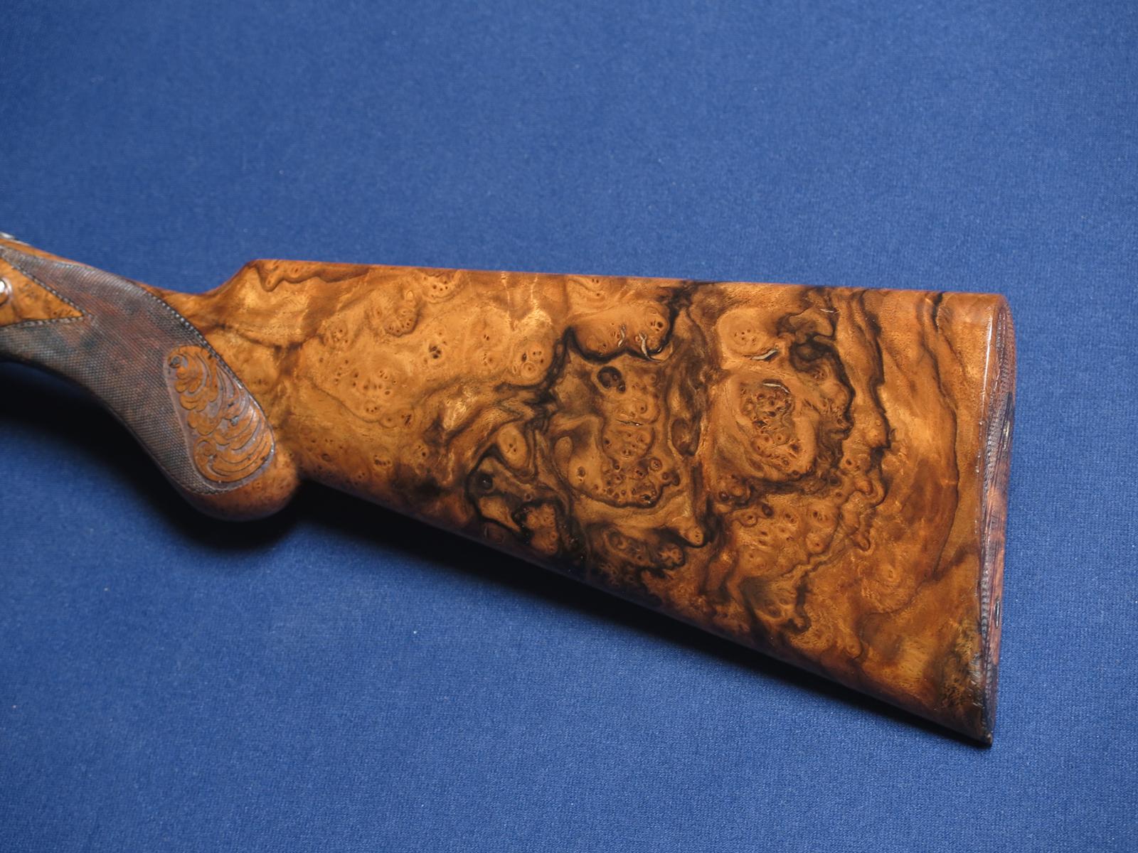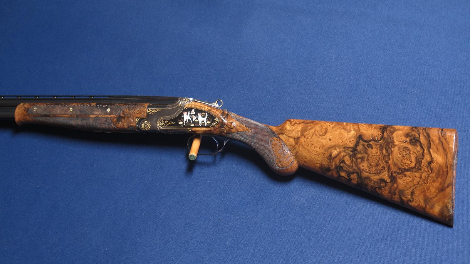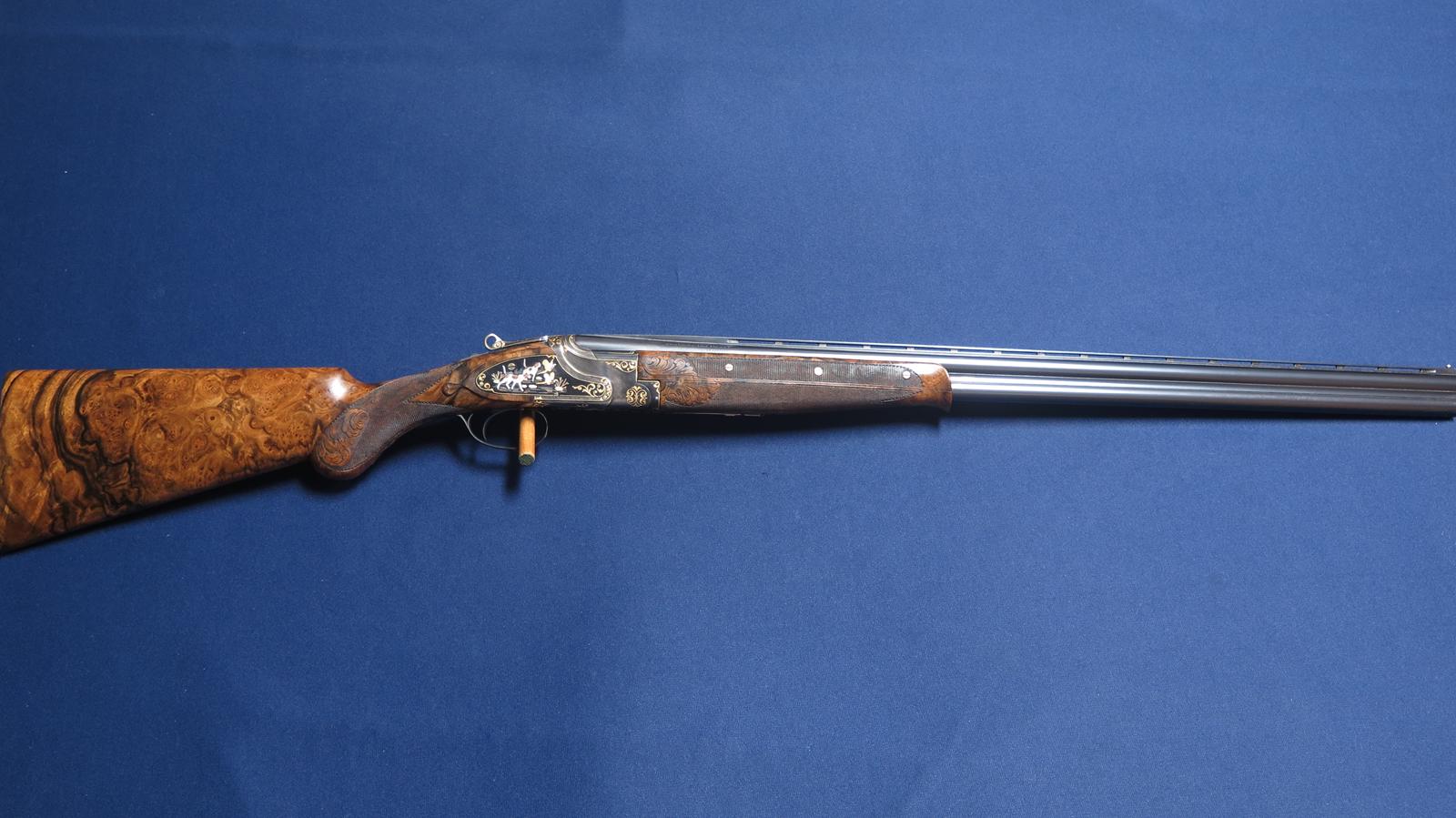 Browning Superposed Exhibition 20ga. Engraved by R. Capece. 1964 mfg. 28 inch barrels. Mod and Full. Beautifully engraved with Dogs and Pheasants on one side and Dogs and Quail on the other. Long tang round knob. 14 5/8 LOP checkered butt. Excellent condition with a few light handling marks by butt plate. In Browning luggage case.