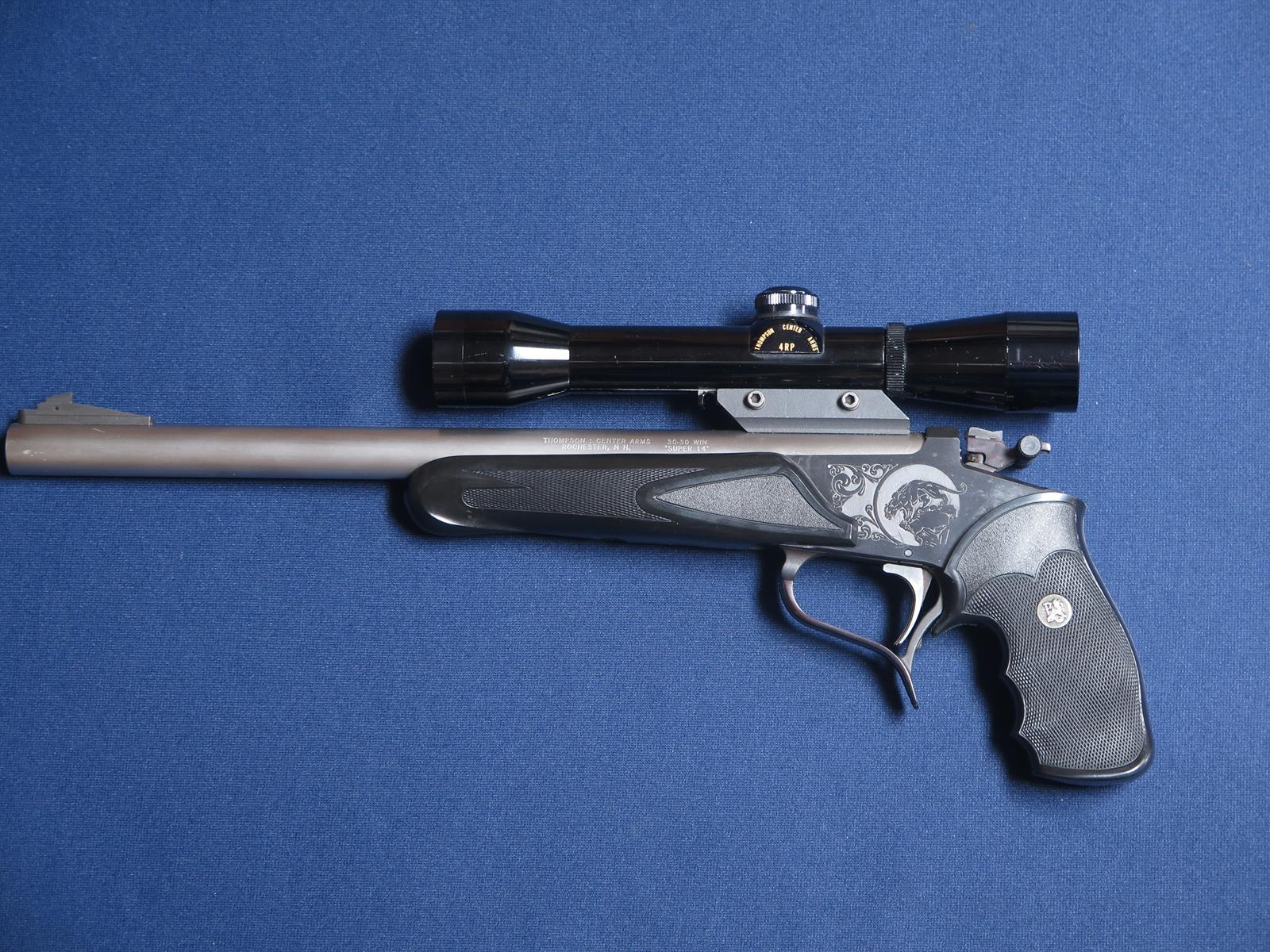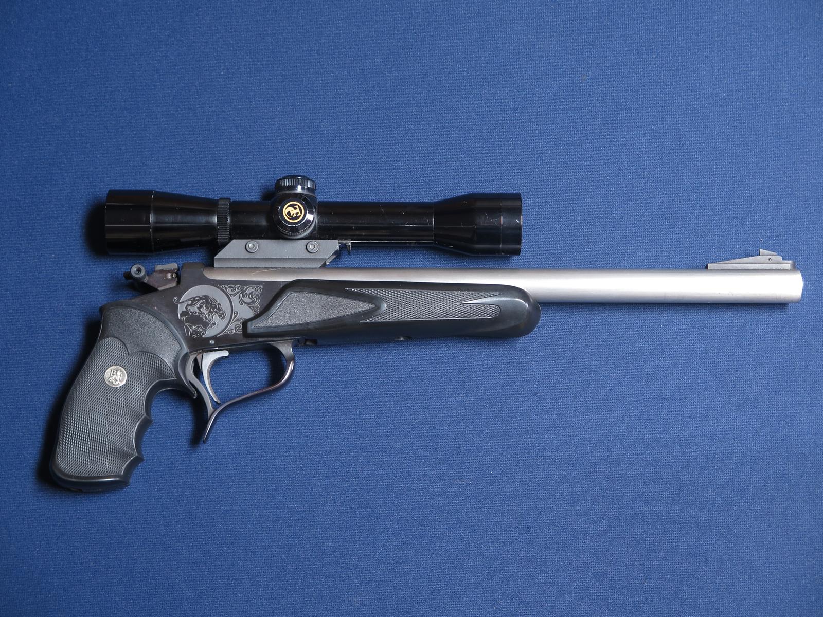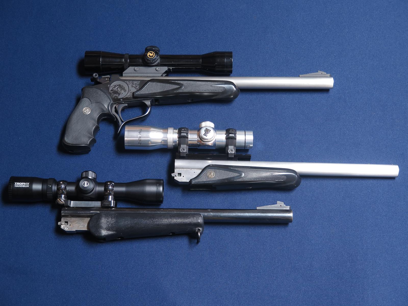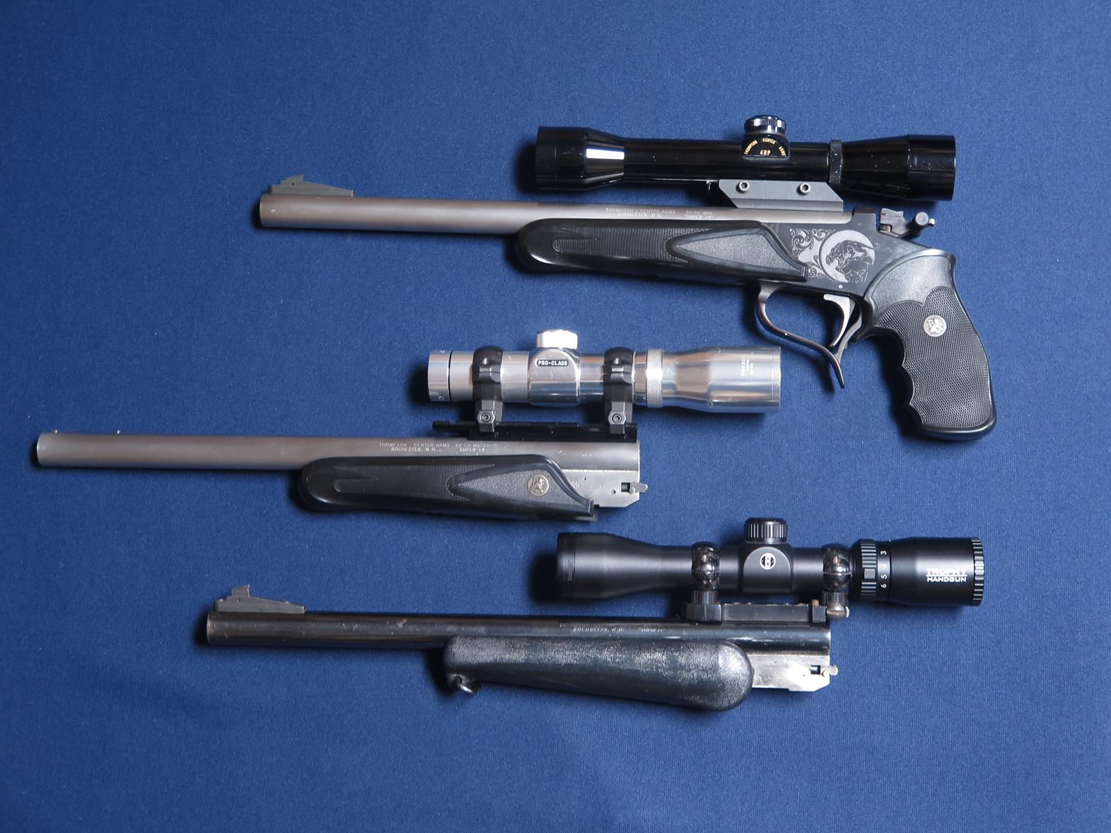 Thompson Contender 3 barrel pistol. 30-30, 223, 22LR. 14 inch stainless 30-30 marked "Super 14". With Thompson Center 4RP pistol scope. 14 inch stainless 22LR "Super 14 Match" barrel with Tasco Pro Class 3x22 pistol scope. And 14 inch blued 223 "Super 14" with Bushnell Trophy 2x6 pistol scope. Excellent condition with Thompson zipper pouch.